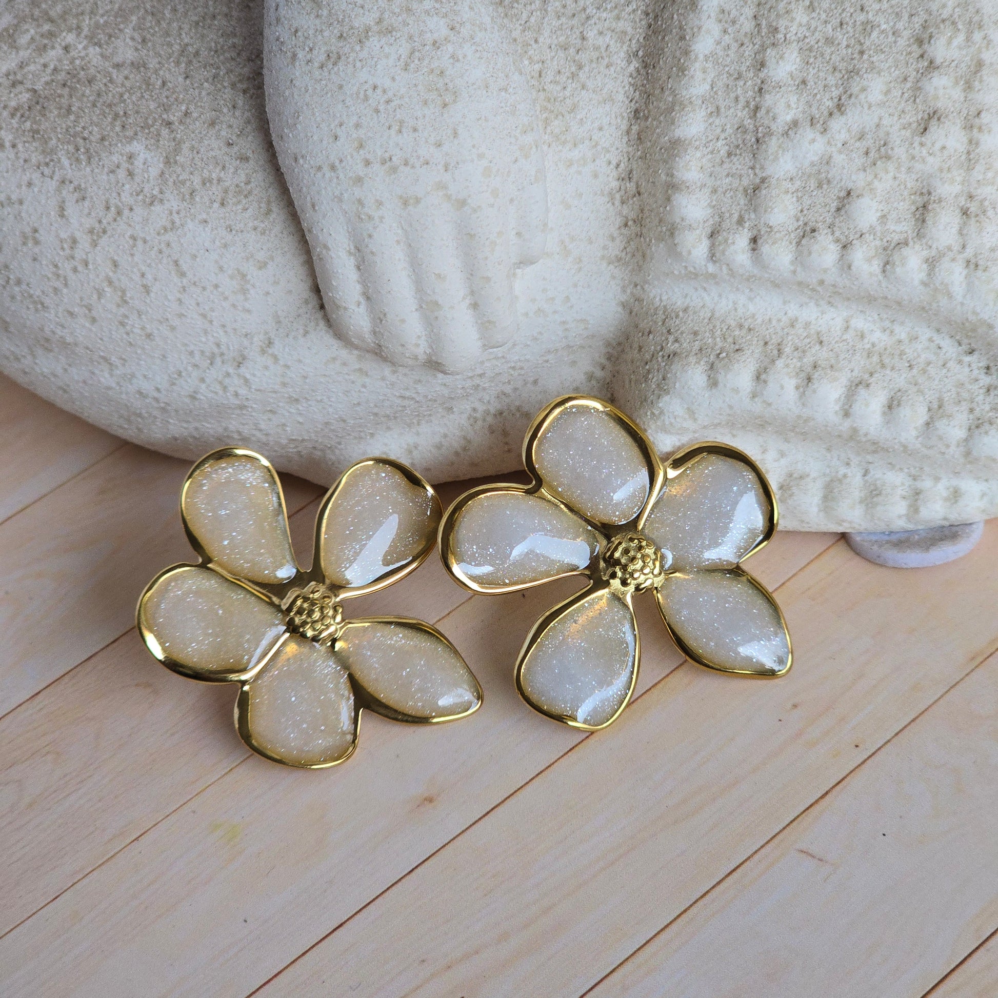 Lleva estos aretes chunky contigo a donde quiera que vayas. Preciosos aretes en forma de flor perlada en color arena, con un marco en oro laminado de 14 kilates que realza su diseño. Una pieza elegante y brillante, ideal para destacar cualquier outfit con un toque sofisticado y moderno. 3.5 cm