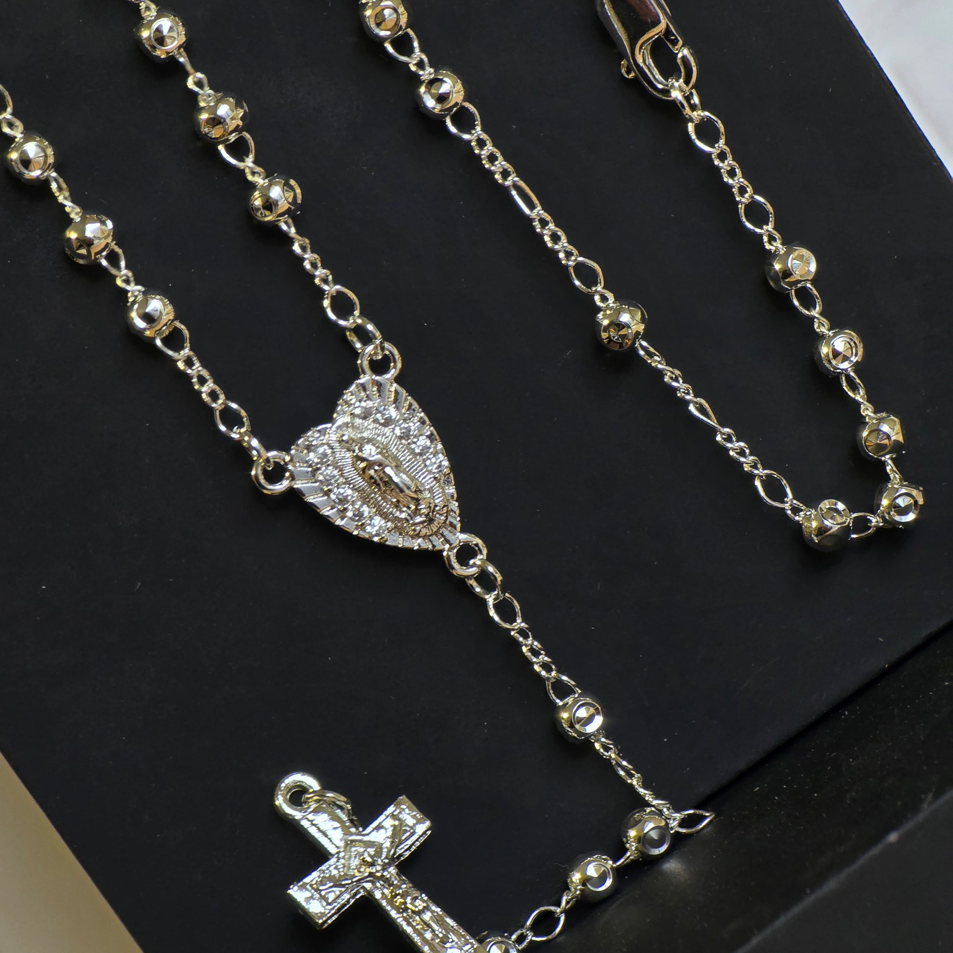 “Elegante rosario de la Virgen, elaborado en laminado en platino con delicadas circonias en color blanco que realzan su brillo y sofisticación. Una pieza de fe y estilo, ideal para acompañarte todos los días.”
