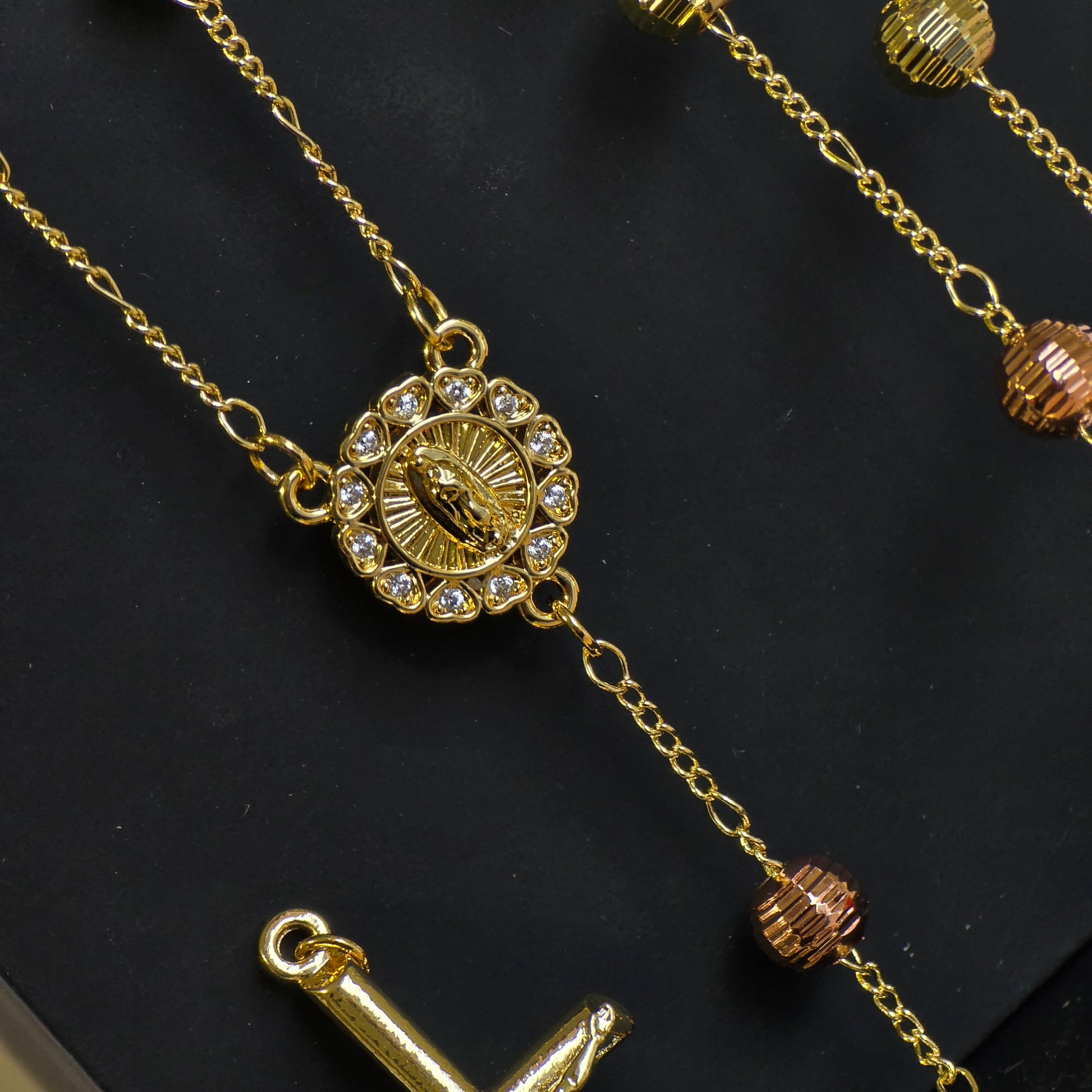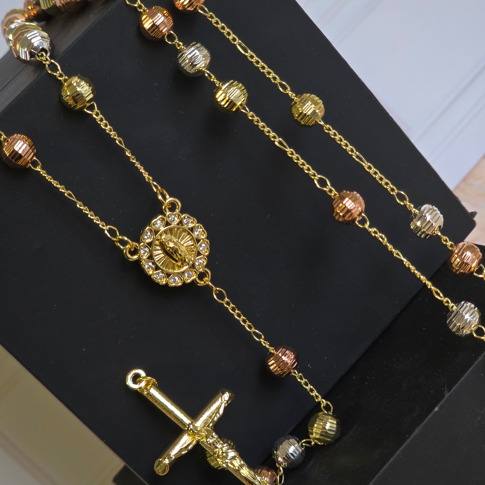 Hermoso rosario Bond laminado en oro de 14 kilates, disponible con medalla de la Virgen y de San Benito. Diseñado con finos detalles y brillo elegante, ideal para expresar tu fe con estilo.”
